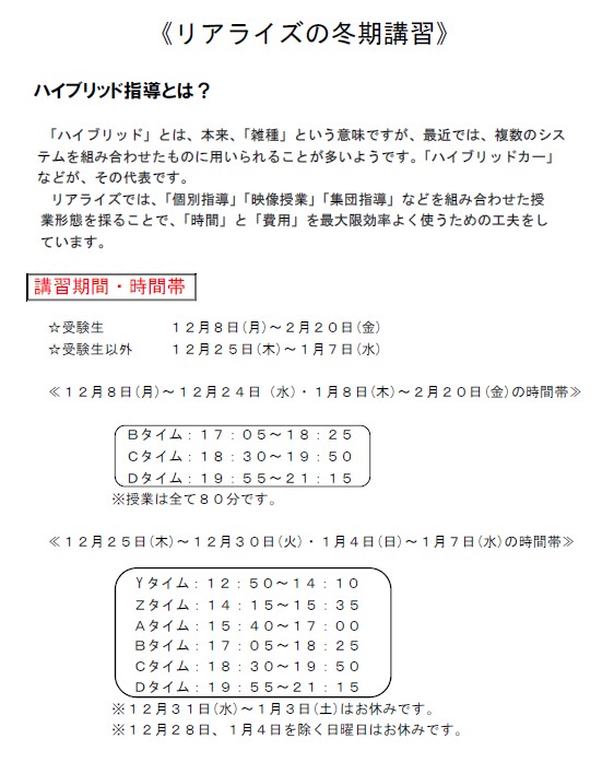 「冬期講習って何でこんなに高額なの?」と疑問を持つご家庭へ。高額な冬期講習や合宿で“伸びた気になるだけ”の学習を終わりにしましょう。必要な学習のみを提供し、無駄な費用を払わせない仕組みで成績向上を実現します。江戸川区船堀周辺にお住まいで「必要なものだけを学習するからこそ伸びる冬期講習」を体験したい方は、リアライズへ。